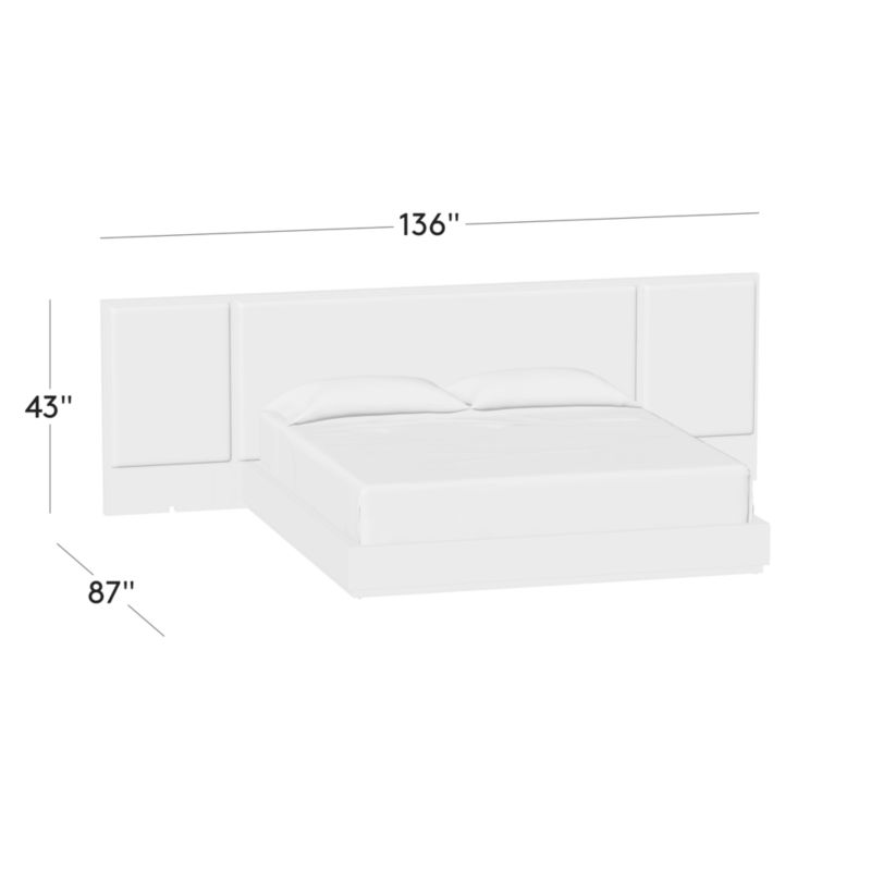 Kara Mann is crafted with Forest Stewardship Council ® (FSC)-certified solid oak and finished in a dark brown stain that reveals the natural grain beneath. A raised plinth base grounds the silhouette while the upholstered headboard features winged side panels that extend beyond the frame—a design choice that creates a cohesive backdrop for nightstands and surrounding elements. Framed with a tailored welt detail, each panel is upholstered in a textured neutral fabric. At once substantial and serene, the design reflects an enduring commitment to form, material and restraint. CB2 exclusive.