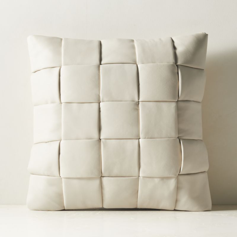 Studio ANANSI intertwines strips of buttery-soft warm white leather. Soft and supple, each piece is masterfully woven across the front to create a textured cover with a solid cotton duck back. Leather has inherent variations of color and texture, and each piece has been selected for its unique beauty; no two pillow covers will be alike. CB2 exclusive.