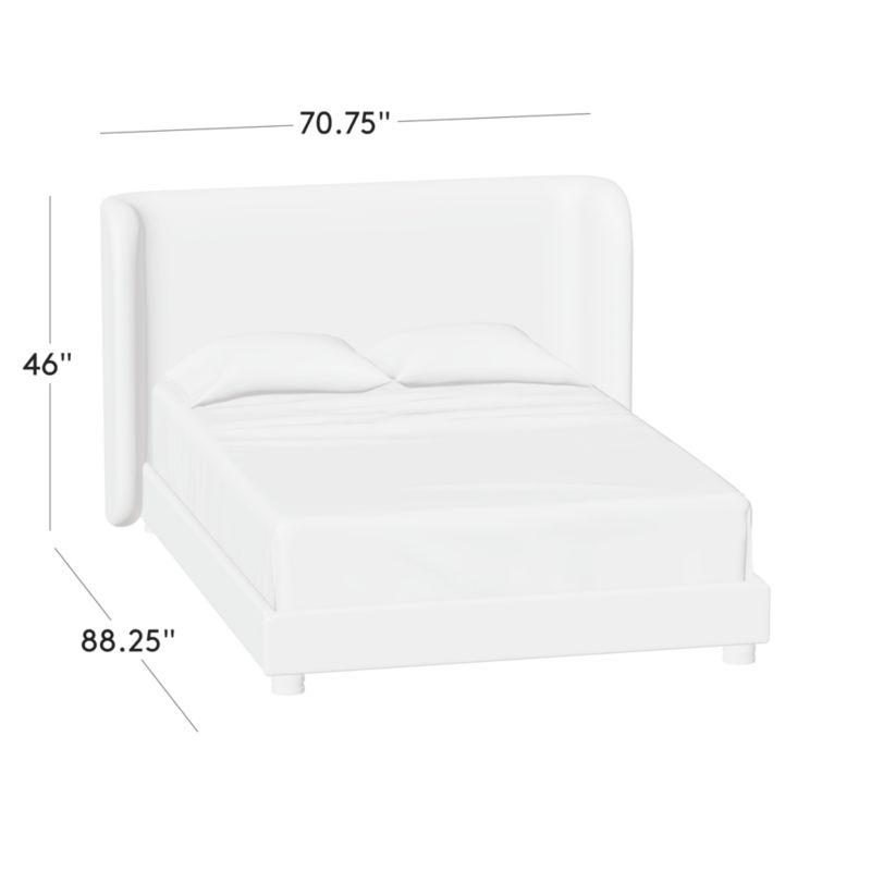 Ross Cassidy mixes sculptural drama with modern comfort. Fully upholstered in lush sage green velvet, the shelter-style wingback headboard creates a cocooning effect—striking from all angles, cozy from within. Solid cylindrical legs carved from Forest Stewardship Council ® (FSC)-certified American oak get a fresh spin with a subtle, lightly cerused finish. CB2 exclusive.