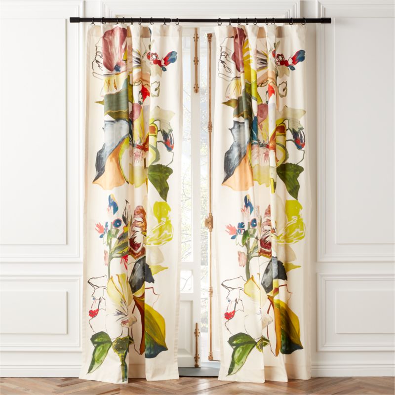 Tailored drapery offers a rich composition of vibrant blooms and subtle variation on a warm white background. Designed by George Venson, curtain panel is loomed from soft cotton yarns for a natural drape that filters light. Hangs beautifully with back tabs, rod pocket or drapery hooks. CB2 exclusive.