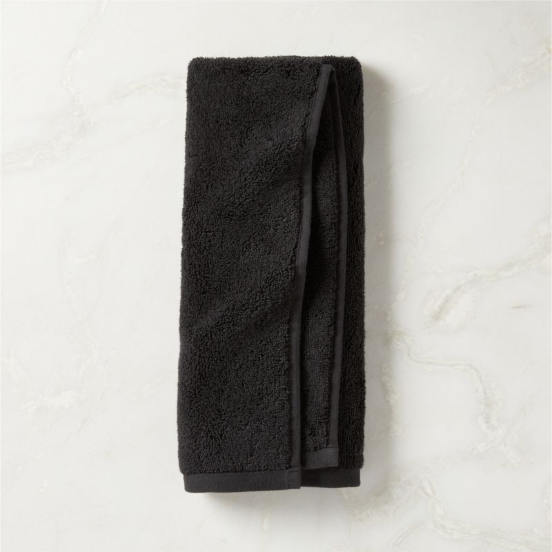 Introducing our most luxurious bath textile collection yet, woven of decadently thick 720-gram certified organic cotton. Ultra-plush and absorbent black hand towel coordinates with matching bath towel, bath sheet and washcloth. CB2 exclusive.