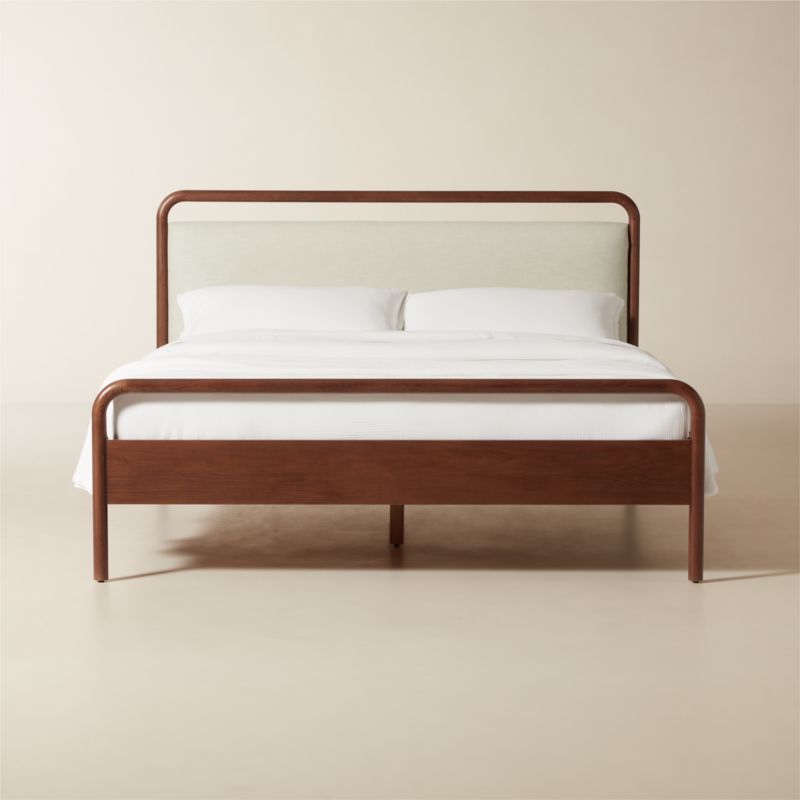 Influenced by the cultural commonalities of ancient civilizations through their use of materials, Miami-based designer Elan Byrd uses a warm mix of materials for the Kamari upholstered bed. Light oak frames a white linen blend upholstered headboard for relaxed bedtime lounging inspired by the past. CB2 exclusive.