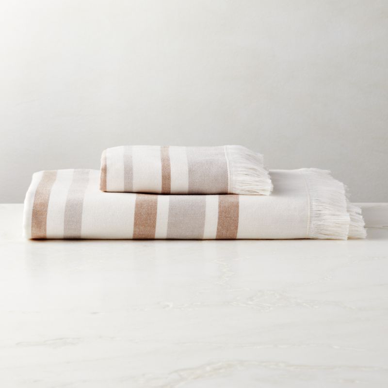 Woven in Portugal from organic-certified cotton, flatweave bath towel features classic copper stripes on a warm white ground. Towel reverses to a terry cloth that's absorbent and soft to the touch. Finished at each end with a fringe detail.