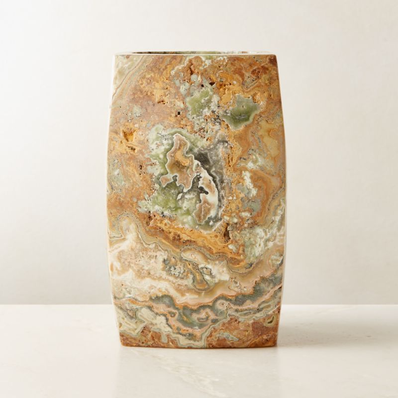 Large, minimalist pillar candle holder by Studio ANANSI exhibits clean curves and precise lines. Cut and shaped from highly active solid green travertine, each piece will display a unique variety of activity in tones of green, tan and white. Style it with the small Kashton candle holder to create a compelling scene. CB2 exclusive.