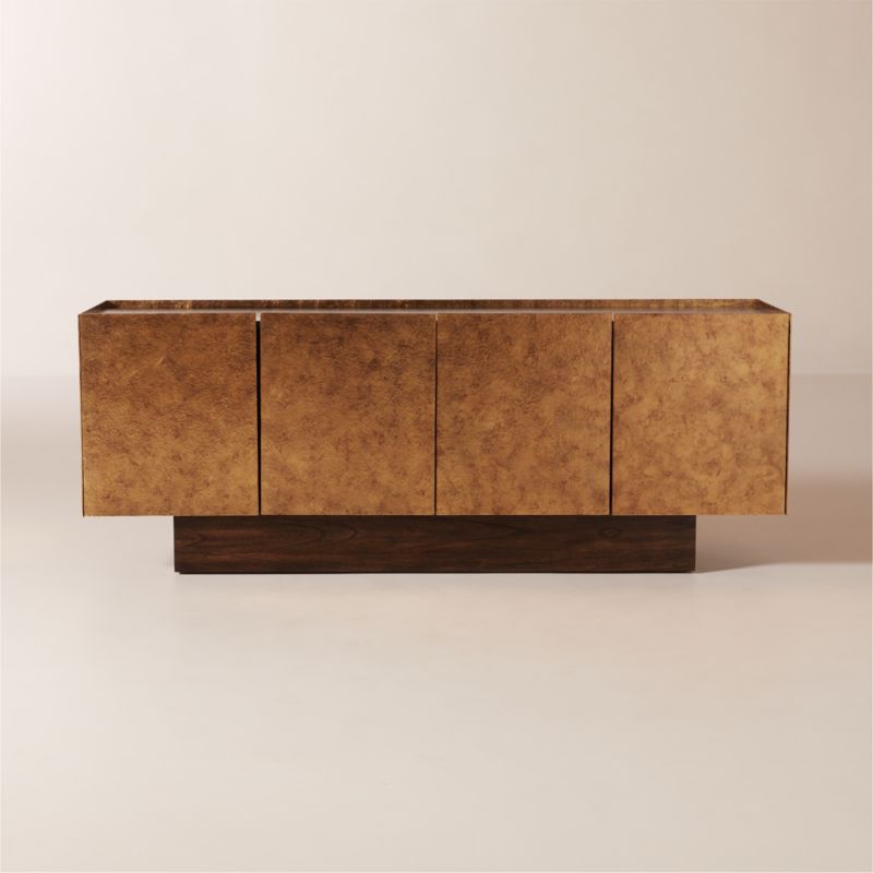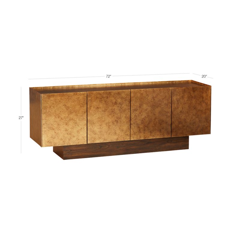 Bronze and gold textured brush strokes mosh across four doors of this handpainted mindi wood credenza. Designed by Mermelada Estudio, the faux-metal sheen brings edge to the piece, rock-solid on a wood plinth base. Learn more about Mermelada Estudio on our blog. CB2 exclusive.