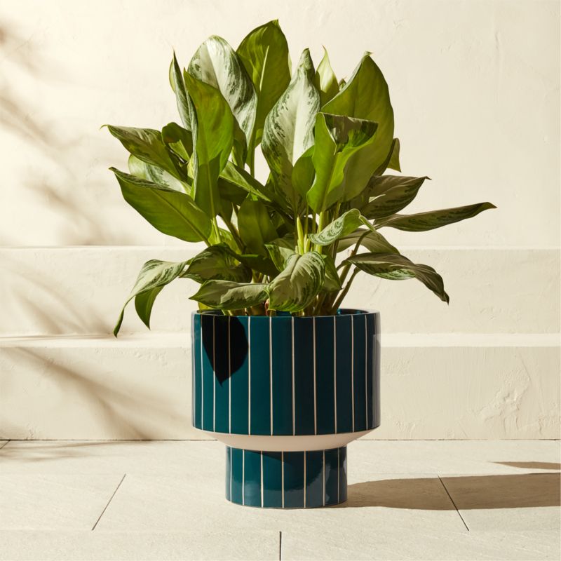 Handcrafted striped ceramic planter lends a modern accent to the outdoors. The silhouette's clean lines taper to a pedestal base, elevating your favorite plants. Combine with the other planters in the Komo collection. CB2 exclusive.