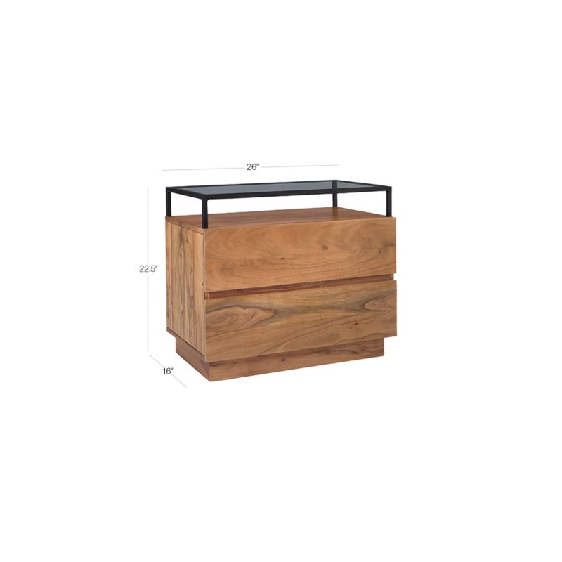 Slim black iron frame floats atop two solid acacia wood drawers and tops nightstand off in clear glass. Best of both storage worlds, open shelf displays jewelry/sunnies/accessories while drawers hold everyday essentials. CB2 exclusive.