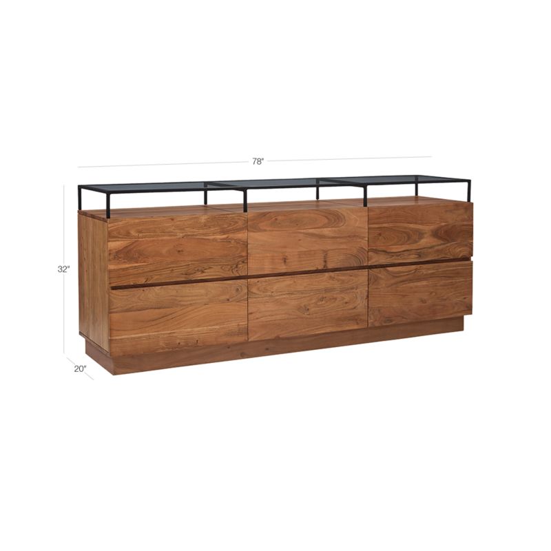 Slim black iron frame floats atop six solid acacia wood drawers and tops dresser off in clear glass. Best of both storage worlds, open shelf displays jewelry/sunnies/accessories while drawers hold everyday essentials. CB2 exclusive.