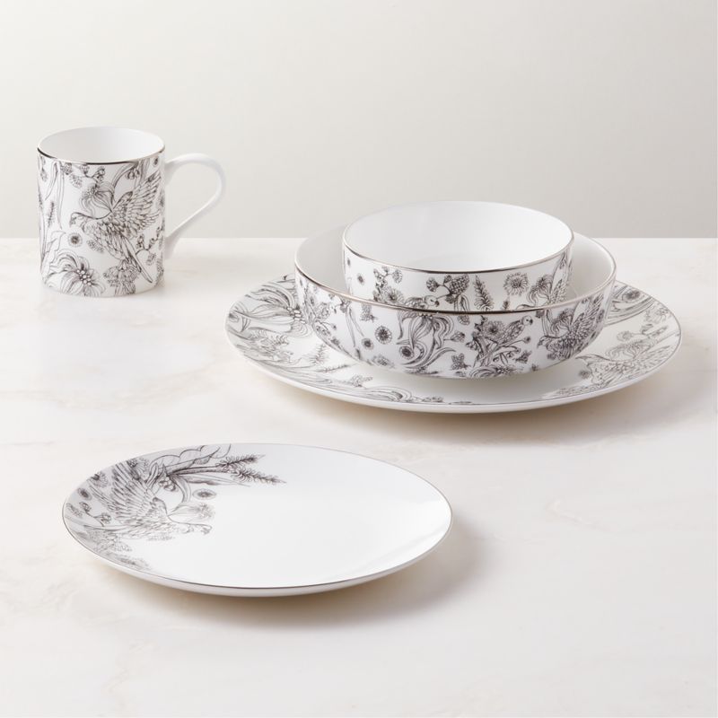 Traditional white bone china dinnerware is updated for the modern table with delicate tropical linework by award-winning designer Silvana Azzi Heras of House of Heras. "The collection is inspired by Australian flora and fauna and my love of rainbow lorikeets, flowering gum trees and eucalyptus leaves," explains the Australian-based designer. The set is finished with a silver rim for an heirloom feel. CB2 exclusive.