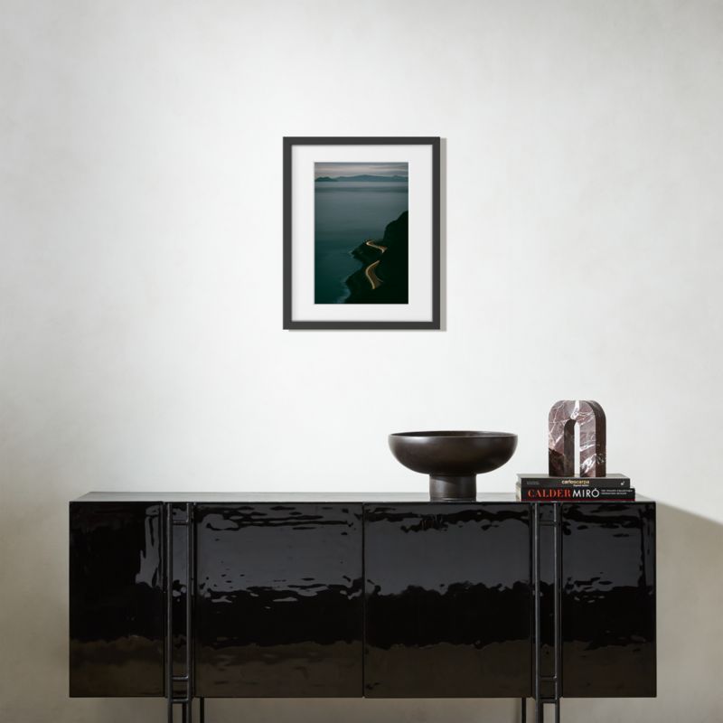 Long-exposure photograph by Raf Maes captures a winding coastal road in Malibu. Part of CB2's collaboration with Sonic Editions, the image is printed and expertly mounted in a handcrafted wood frame.