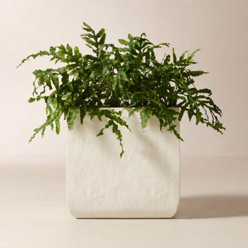 Planter by Mermelada Estudio plays with a square-soft effect, where clean lines meet rounded edges to create a shape that feels structured yet warm. What looks like plaster is actually a weather-resistant polyresin, cast in a textured mold to achieve a handmade look. Matte white finish looks light and bright in the sun. CB2 exclusive.