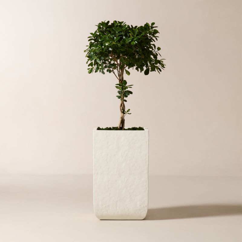 Planter by Mermelada Estudio plays with a square-soft effect, where clean lines meet rounded edges to create a shape that feels structured yet warm. What looks like plaster is actually a weather-resistant polyresin, cast in a textured mold to achieve a handmade look. Matte white finish looks light and bright in the sun. CB2 exclusive.