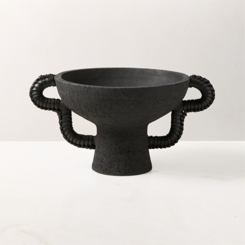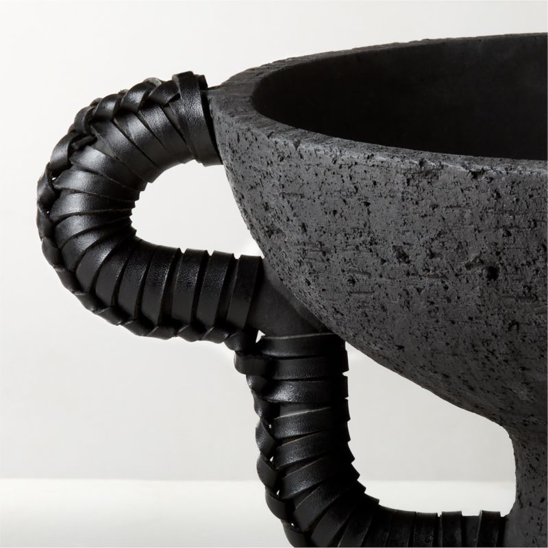 Matte black vase makes a sculptural statement. Skilled artisans in the Philippines throw the clay by hand, shaping it with organic curves and textural variations. Playfully sculpted handles are wrapped in plaited black leather, adding a rich, monochromatic accent. CB2 exclusive.