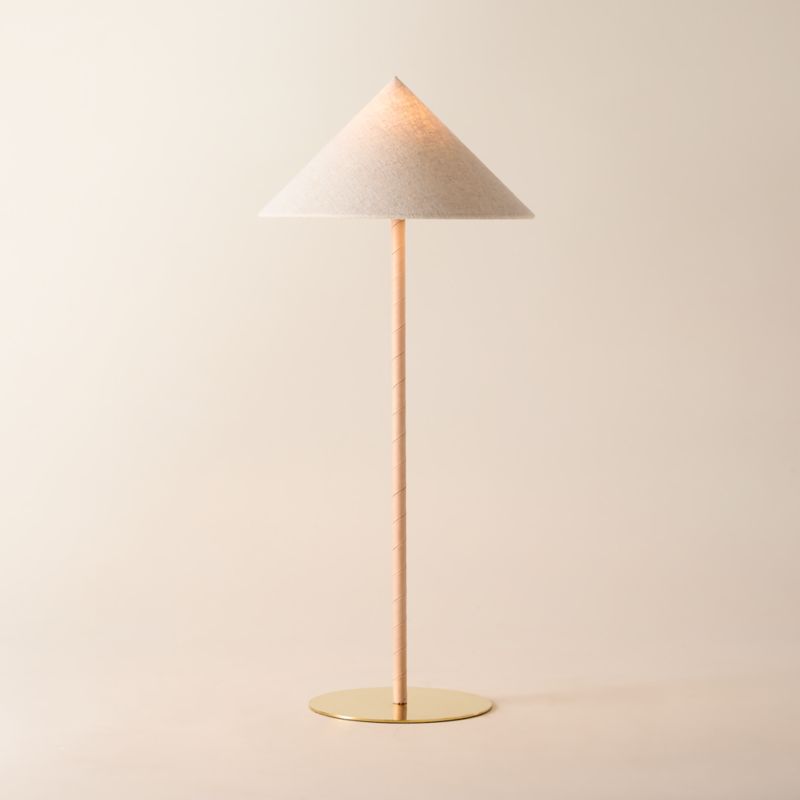 An elevated mix of materials, handmade leather-wrapped table lamp from Mateo Aguirre looks elegant in any setting. The tapered linen shade is balanced by a slim stem and smooth brass base. Brass is unlacquered, offering a living finish that will develop the patina of a vintage find. CB2 exclusive.