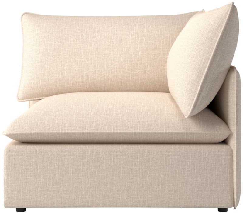 Sink into relaxed luxury with this low-slung design by Mermelada Estudio. Certified sustainable by the Forest Stewardship Council ® (FSC), the corner chair wood frame is paired with deep, pillow-topped seat and back cushions. Soft, linen-like performance fabric is finished with a clean piping welt. Pair with the ottoman or armless chair for a configuration that fits your space. CB2 exclusive.
