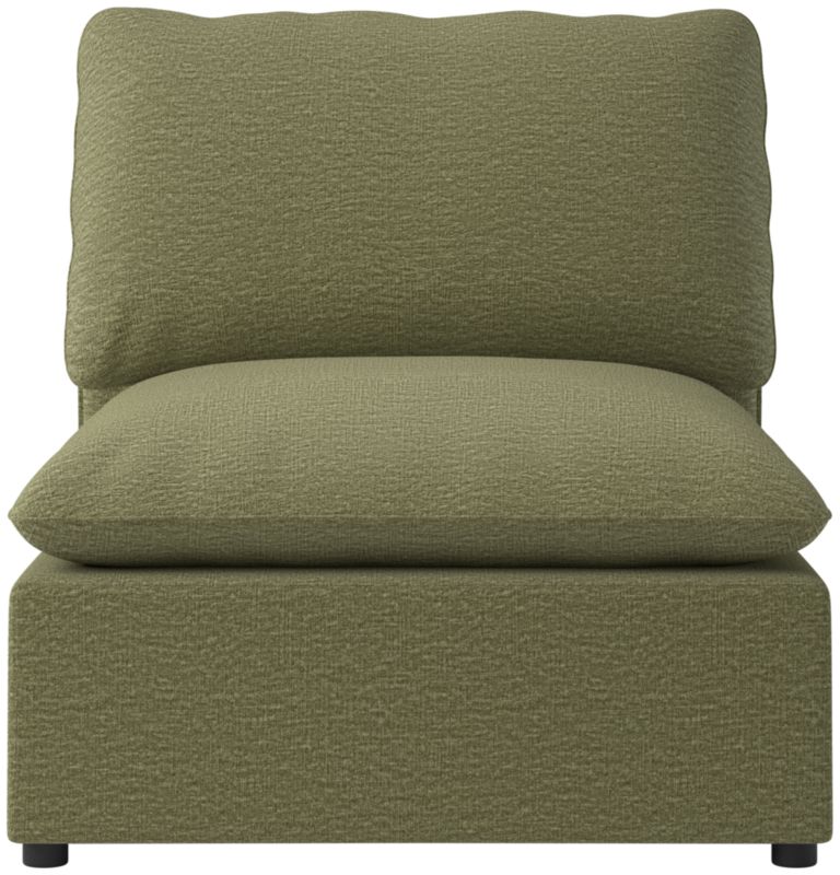 Low-slung, shallow-depth armless chair by Barcelona-based Mermelada Estudio is designed for lounging. Upholstered in a textured, linen-like performance fabric, the chair's standard-sized frame is topped with pillowy cushions finished with a clean piping welt. Arrange and rearrange pieces from the Lumis sectional collection to fit your changing needs. CB2 exclusive.