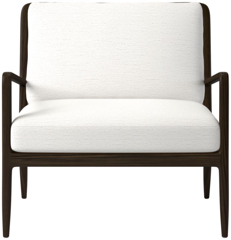 Hand-assembled accent chair by Mermelada Estudio balances a slim, curved wood frame with a fabric cushion. Red oak frame, certified sustainable by the Forest Stewardship Council®, sports steam-bent arms shaped at a tight radius for an impossibly thin form. The chair's streamlined silhouette pairs perfectly with the warm, organic feel of the materials to create a seating that's equally comfortable and sophisticated. CB2 exclusive.