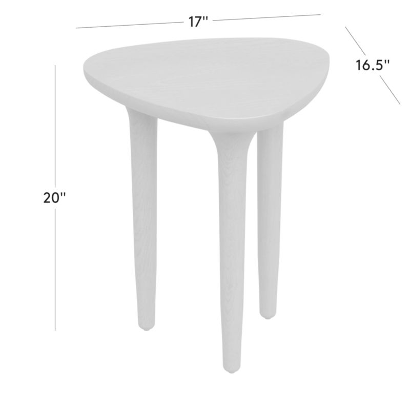 Warm oak side table by Melbourne-based design studio VUUE updates any space with its unexpected silhouette. Soft curves of white oak veneer rest atop three tapered legs for a vintage-inspired look. Style on its own or pair with the Macello coffee and console tables. CB2 exclusive.