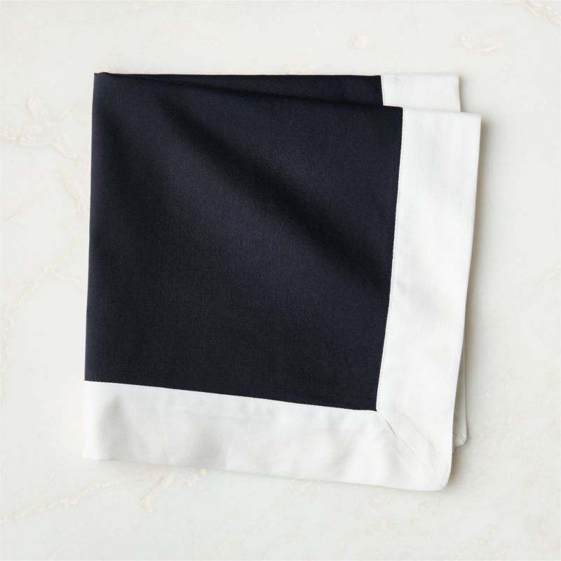 Crisp cotton sateen napkin adds architectural polish to the table. The smooth black fabric is edged with a bold white border and finished with mitered corners for a clean, tailored silhouette. Pair with the matching placemat for a cohesive tablescape. CB2 exclusive.