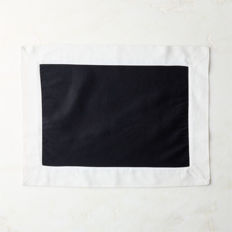 Crisp cotton sateen placemat adds architectural polish to the table. The smooth black fabric is edged with a bold white border and finished with mitered corners for a clean, tailored silhouette. Pair with the matching napkin for a cohesive tablescape. CB2 exclusive.
