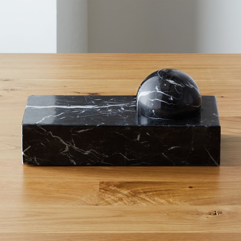 Square meets circle meets paper in hand-carved black marble with sophisticated white veining. Doubles as a paperweight and catchall for office clutter while bringing serious GQ style to the table. CB2 exclusive.