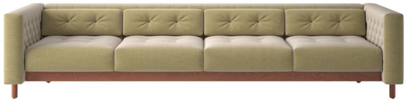This sleek, low sofa was originally created by iconic Italian designer Gianfranco Frattini for the fashionable Restaurant St. Andrews in the heart of old Milan. Now, a modern classic returns with the same spirit of the original design, reimagined with room for four. Period-authentic details include hand-sewn button tufts on the interior sides and cushions, along with the inset walnut legs that are characteristic of the designer's signature style. CB2 exclusive.