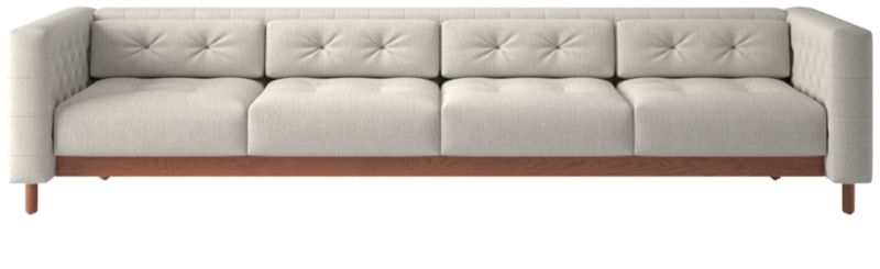 This sleek, low sofa was originally created by iconic Italian designer Gianfranco Frattini for the fashionable Restaurant St. Andrews in the heart of old Milan. Now, a modern classic returns with the same spirit of the original design, reimagined with room for four. Period-authentic details include hand-sewn button tufts on the interior sides and cushions, along with the inset walnut legs that are characteristic of the designer's signature style. CB2 exclusive.