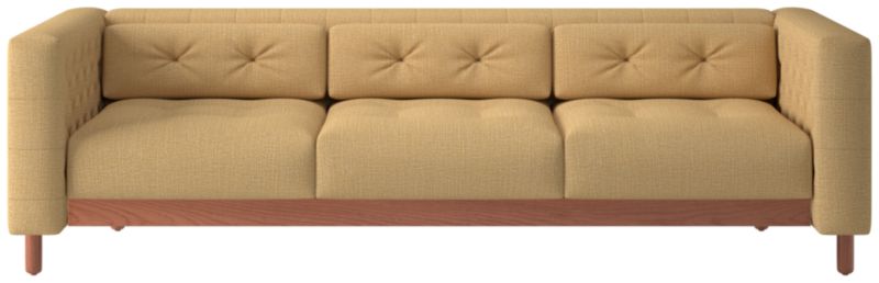 This sleek, low sofa was originally created by iconic Italian designer Gianfranco Frattini for the fashionable Restaurant St. Andrews in the heart of old Milan. Now, a modern classic returns with the same spirit of the original design, with room for three. Period-authentic details include hand-sewn button tufts on the interior sides and cushions, along with the inset walnut legs that are characteristic of the designer's signature style. CB2 exclusive.