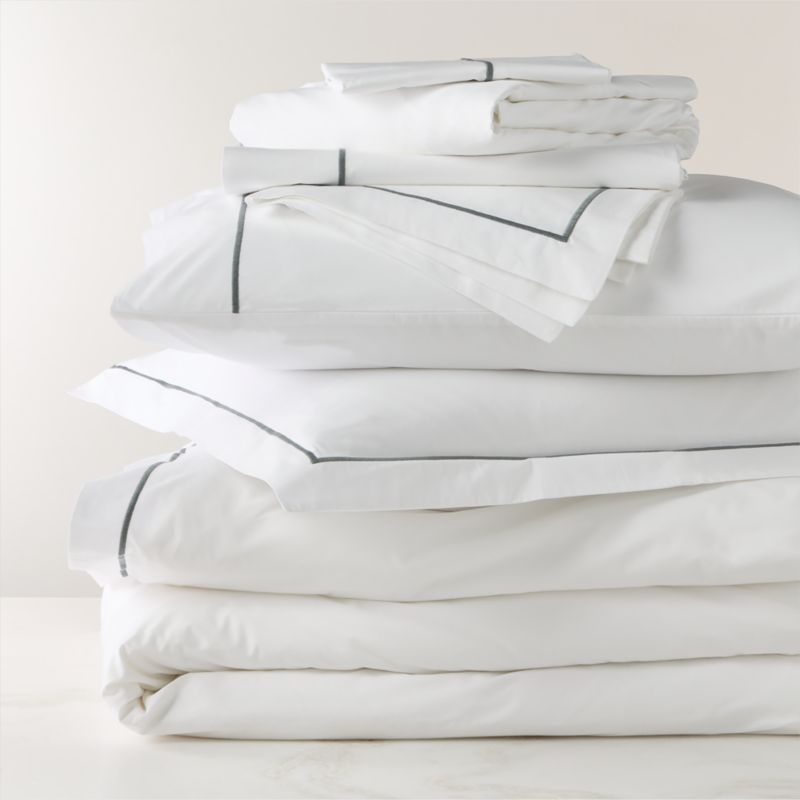 Woven from 100% certified organic cotton percale, white bedding pairs the soft, supple hand of cotton with classic hotel-style details. Tailored faded teal stitching lends an understated elegance. Bedding set includes one duvet cover, two king pillow shams, one flat sheet, one fitted sheet and two king pillowcases. CB2 exclusive.