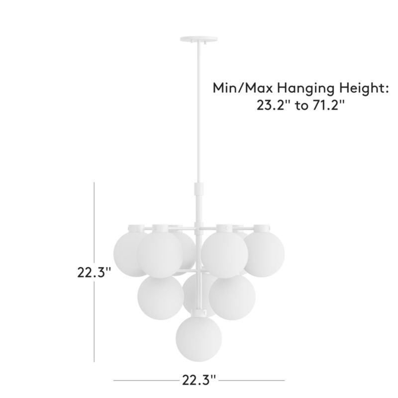 Tiered pendant light by Jannis Ellenberger is a modern interpretation of retro globe bulb designs, marrying simple fundamental design with refined details. Suspended from a polished brass canopy, 10 softly frosted glass globes are accented with exposed brass hardware, offering a refined mix of contrasting finishes. CB2 exclusive.