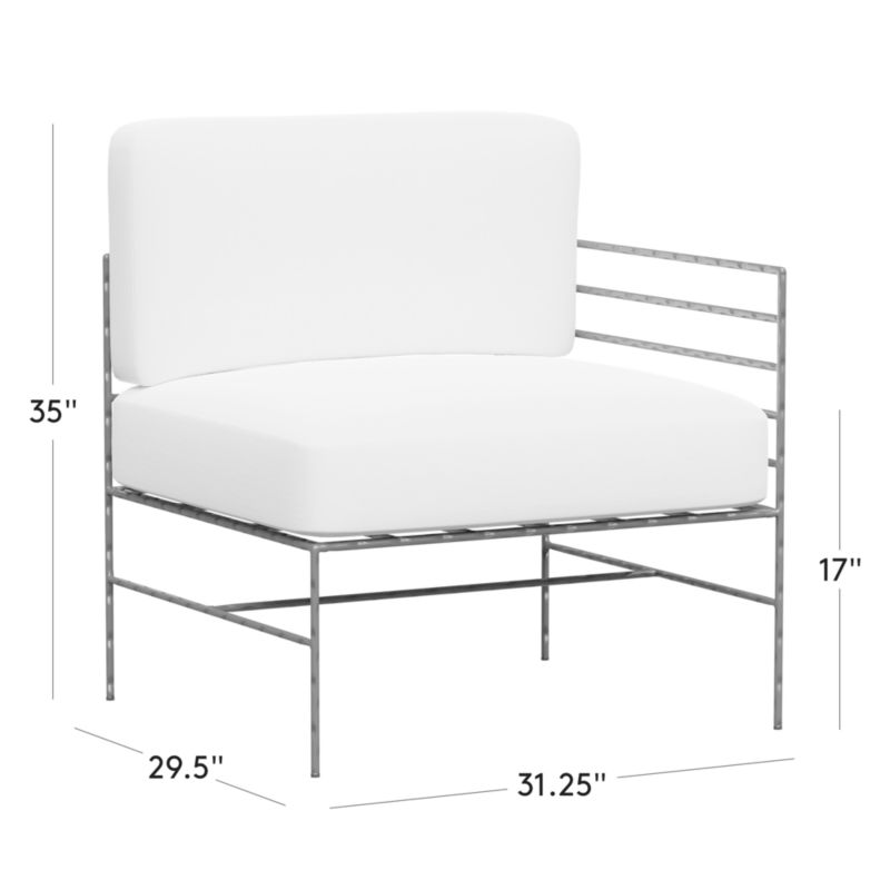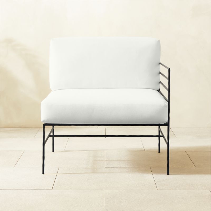 From afar, outdoor right-side chair by Mermelada Estudio is well-defined by clean lines and angled geometry. Solid hammered iron frame adds timeless textural interest and lasting allure. Plush cushions are upholstered in fade-resistant, low-maintenance white Sunbrella® performance fabric for ease of care and beauty. May be combined with other pieces from the Marteau collection to create a sectional. CB2 exclusive.