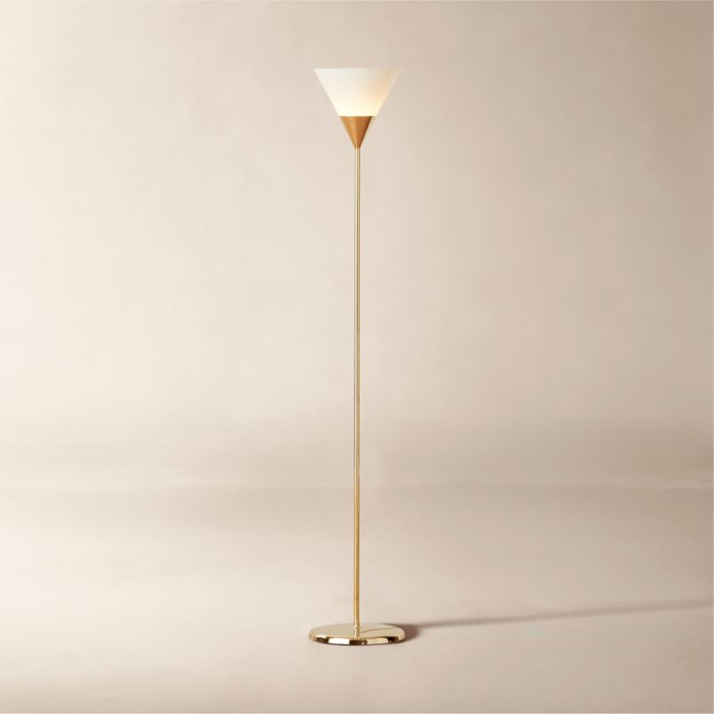Studio ANANSI's modern torchiere-style floor lamp offers sleek lines of brass in this minimalist design. The opaline glass shade is elevated on a thin brass pole for beautifully balanced proportions. Brass is unlacquered, offering a living finish that will develop the patina of a vintage find. CB2 exclusive.