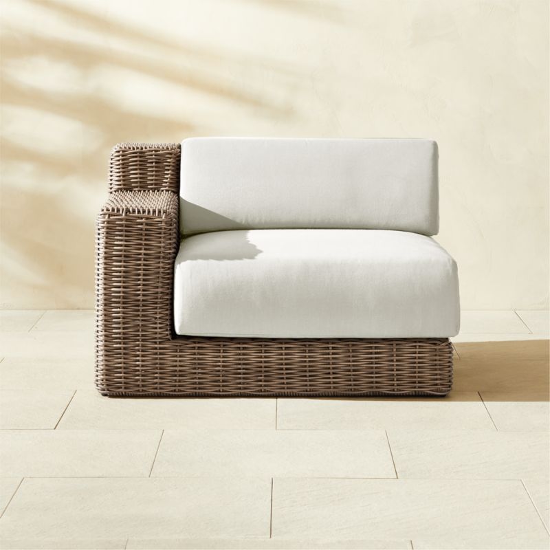 Mermelada Estudio is well-suited for entertaining. Weather-resistant faux rattan weave covers a lightweight yet strong aluminum frame, all topped by warm white Sunbrella ® performance fabric cushions that retain their good looks season after season. May be combined with other pieces from the Maylin collection to create a sectional. CB2 exclusive.