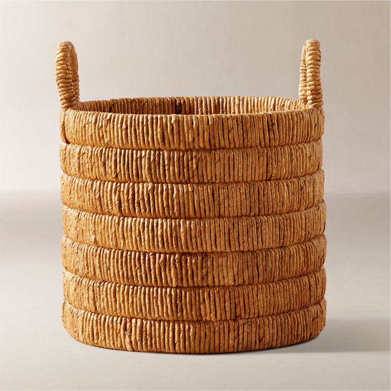 Handwoven banana leaves from Indonesia stripe this extra-large storage basket in natural high-low tones. Perfect for stashing throws and pillows or housing larger faux plants. Two large handles make moving easy. Designed to nest with smaller sizes for easy cleanup when not in use. CB2 exclusive.