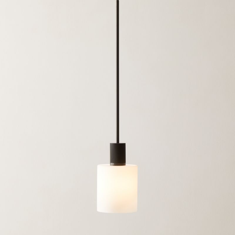 Crisp, tailored fine rib detailing speaks to Brett Beldock's years in fashion design. These blackened brass details sit atop the shade and at the canopy, contrasting with an opaque glass shade for a simple yet considered look. CB2 exclusive.