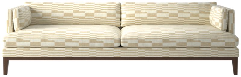 Assembled in Mississippi, modern sofa by Melbourne-based design studio VUUE is made for lounging. Slim arms, tapered legs, deep cushions and a bullnose ash wood base all speak to the sofa's casual style. Upholstered in a linen-blend fabric with a performance finish. CB2 exclusive.