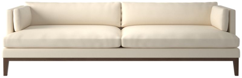 Assembled in Mississippi, modern sofa by Melbourne-based design studio VUUE is made for lounging. Slim arms, tapered legs, deep cushions and a bullnose ash wood base all speak to the sofa's casual style. Upholstered in a linen-blend fabric with a performance finish. CB2 exclusive.