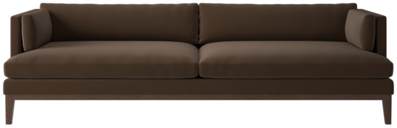 Assembled in Mississippi, modern sofa by Melbourne-based design studio VUUE is made for lounging. Slim arms, tapered legs, deep cushions and a bullnose ash wood base all speak to the sofa's casual style. Upholstered in a linen-blend fabric with a performance finish. CB2 exclusive.