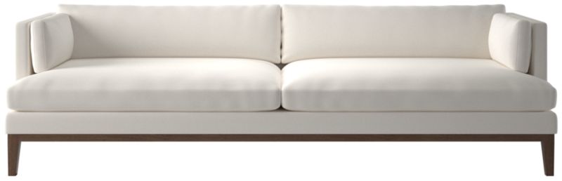 Assembled in Mississippi, modern sofa by Melbourne-based design studio VUUE is made for lounging. Slim arms, tapered legs, deep cushions and a bullnose ash wood base all speak to the sofa's casual style. Upholstered in a linen-blend fabric with a performance finish. CB2 exclusive.