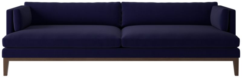 Assembled in Mississippi, modern sofa by Melbourne-based design studio VUUE is made for lounging. Slim arms, tapered legs, deep cushions and a bullnose ash wood base all speak to the sofa's casual style. Upholstered in a linen-blend fabric with a performance finish. CB2 exclusive.
