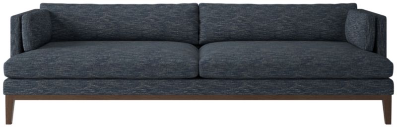 Assembled in Mississippi, modern sofa by Melbourne-based design studio VUUE is made for lounging. Slim arms, tapered legs, deep cushions and a bullnose ash wood base all speak to the sofa's casual style. Upholstered in a linen-blend fabric with a performance finish. CB2 exclusive.