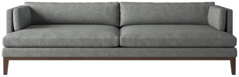 Assembled in Mississippi, modern sofa by Melbourne-based design studio VUUE is made for lounging. Slim arms, tapered legs, deep cushions and a bullnose ash wood base all speak to the sofa's casual style. Upholstered in a linen-blend fabric with a performance finish. CB2 exclusive.