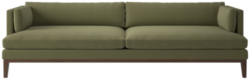 Assembled in Mississippi, modern sofa by Melbourne-based design studio VUUE is made for lounging. Slim arms, tapered legs, deep cushions and a bullnose ash wood base all speak to the sofa's casual style. Upholstered in a linen-blend fabric with a performance finish. CB2 exclusive.