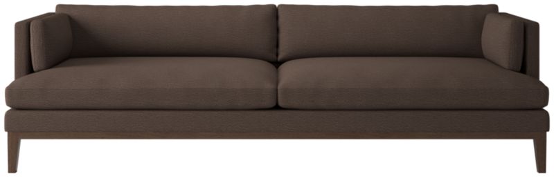 Assembled in Mississippi, modern sofa by Melbourne-based design studio VUUE is made for lounging. Slim arms, tapered legs, deep cushions and a bullnose ash wood base all speak to the sofa's casual style. Upholstered in a linen-blend fabric with a performance finish. CB2 exclusive.