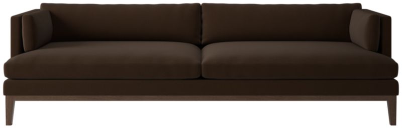 Assembled in Mississippi, modern sofa by Melbourne-based design studio VUUE is made for lounging. Slim arms, tapered legs, deep cushions and a bullnose ash wood base all speak to the sofa's casual style. Upholstered in a linen-blend fabric with a performance finish. CB2 exclusive.
