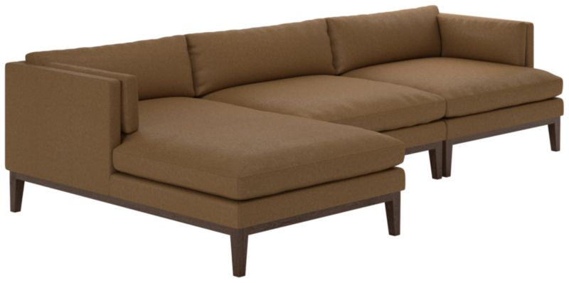 Hand-assembled in Mississippi, modern leather sectional by Melbourne-based design studio VUUE is made for lounging. Slim arms, tapered legs, deep cushions and a bullnose ash wood base all speak to the sectional's casual style. Customize the sectional layout to suit your individual space. CB2 exclusive.