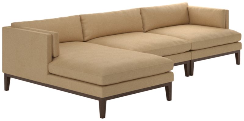 Hand-assembled in Mississippi, modern leather sectional by Melbourne-based design studio VUUE is made for lounging. Slim arms, tapered legs, deep cushions and a bullnose ash wood base all speak to the sectional's casual style. Customize the sectional layout to suit your individual space. CB2 exclusive.
