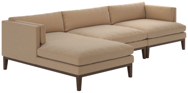 Assembled in Mississippi, modern sectional by Melbourne-based design studio VUUE is made for lounging. Slim arms, tapered legs, deep cushions and a bullnose ash wood base all speak to the sectional's casual style. Upholstered in a linen-blend fabric with a performance finish. Customize the sectional layout to suit your individual space. CB2 exclusive.