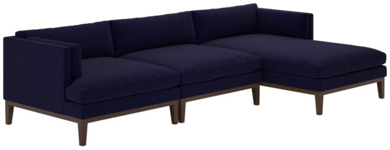 Assembled in Mississippi, modern sectional by Melbourne-based design studio VUUE is made for lounging. Slim arms, tapered legs, deep cushions and a bullnose ash wood base all speak to the sectional's casual style. Upholstered in a linen-blend fabric with a performance finish. Customize the sectional layout to suit your individual space. CB2 exclusive.