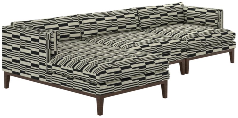 Assembled in Mississippi, modern sectional by Melbourne-based design studio VUUE is made for lounging. Slim arms, tapered legs, deep cushions and a bullnose ash wood base all speak to the sectional's casual style. Upholstered in a linen-blend fabric with a performance finish. Customize the sectional layout to suit your individual space. CB2 exclusive.